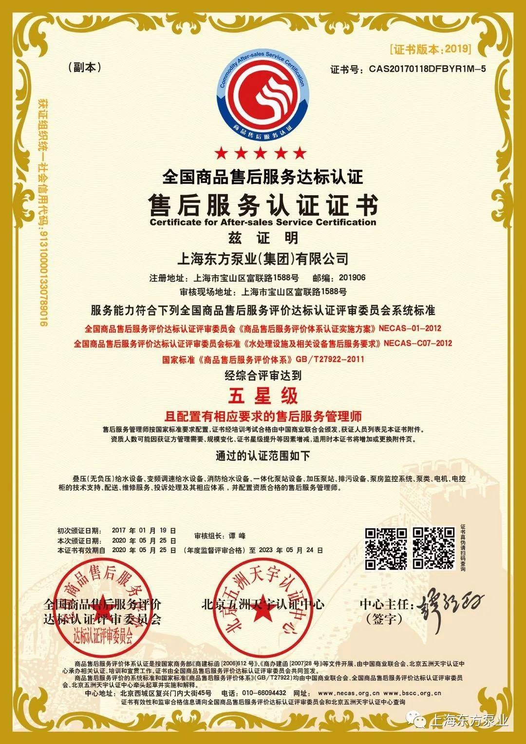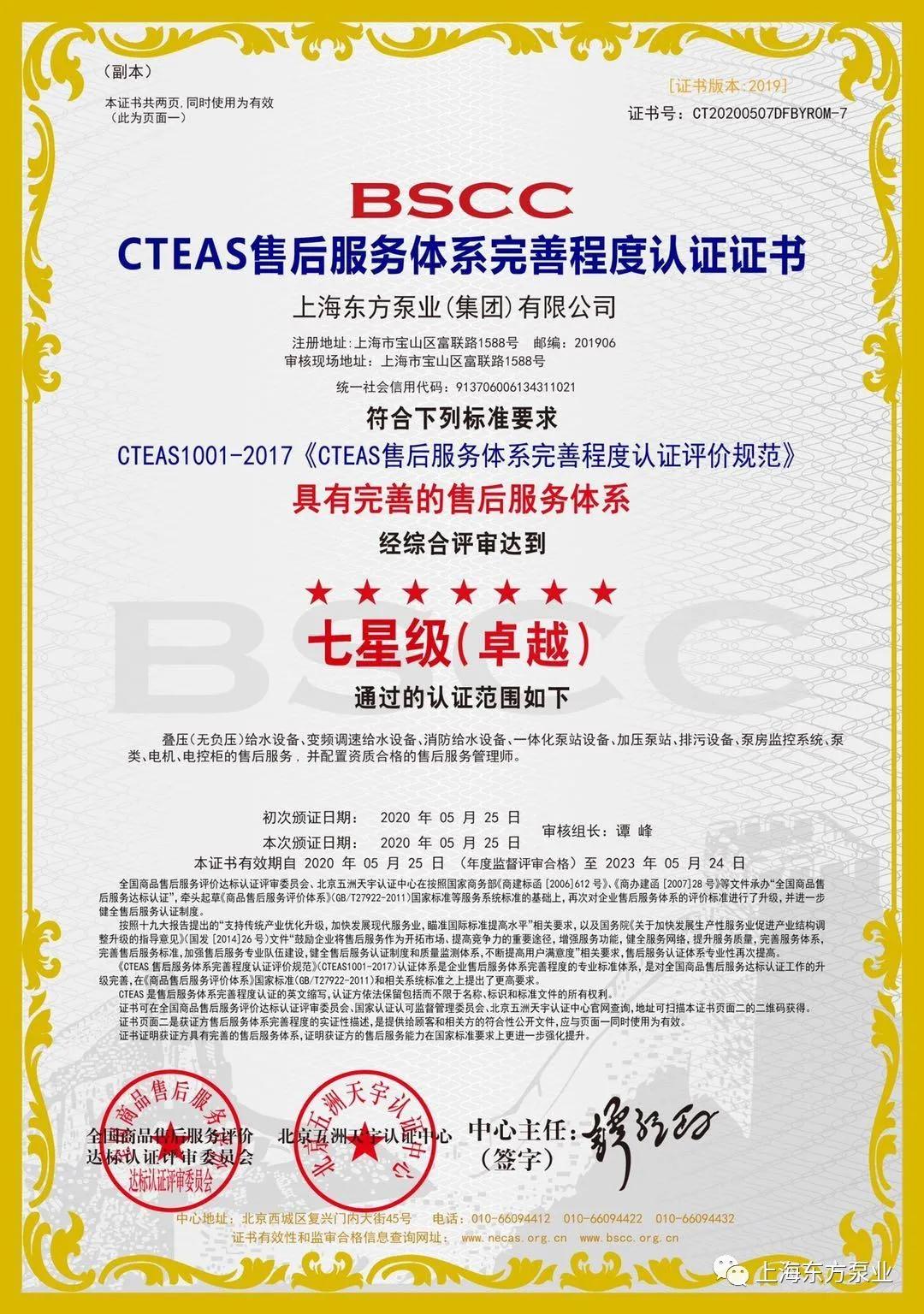 東方泵業(yè)七星級(jí)(卓越)售后服務(wù)體系認(rèn)證證書的獲評(píng),意味著東方泵業(yè)售后在服務(wù)功能、服務(wù)網(wǎng)絡(luò)、服務(wù)質(zhì)量、服務(wù)體系、服務(wù)標(biāo)準(zhǔn)等方面居于國(guó)內(nèi)領(lǐng)先水平。